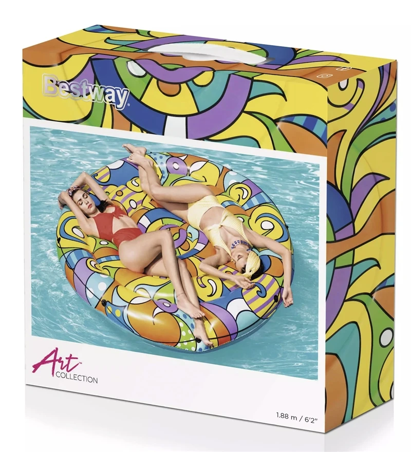 Bestway’s POP Island pool float features vibrant graphics inspired by the famous Pop art of the 1950s. A wraparound grab rope is secured by built-in grommets, so the float is easy to maneuver, and interlocking quick-release valves make the inflation and deflation process a breeze.
