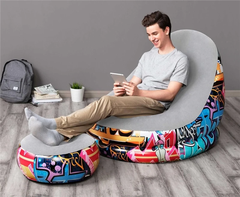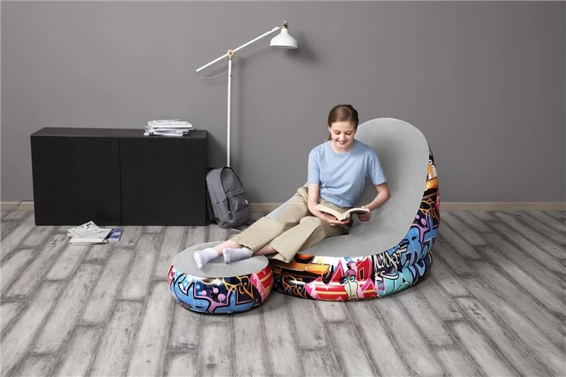 The Bestway Graffiti Comfort Cruiser inflatable sofa chair is comfortable and funky and spices up every living room, dormitory and terrace. Or you can keep it as an additional seat for your next party. It is easy to assemble, requires minimal storage space and, above all, is a lot of fun! With the street art-inspired design, the comfortable seat and the included footrest, the armchair is perfect for visiting guests, as a decorative element, to cheer on at the endgame or as a piece of furniture in the dormitory. The Comfort Cruiser also has a cup holder so that you always have your drink or snacks to hand. And: You can use it indoors as well as outdoors.