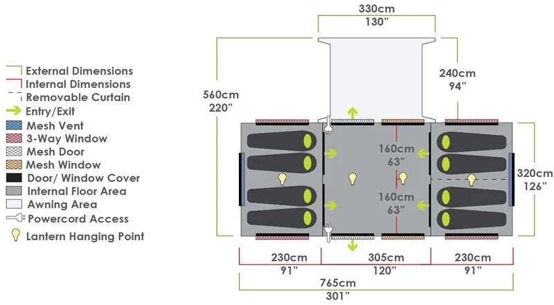 Layout | The Delta Force is the ultimate solution for a large family. Rooms on each side of the tent can comfortably fit two twin camp beds and feature two large internal controllable windows. These rooms are separated by a large central living room offering privacy for all. The living area features both front and rear access doors for convenience and offers an impressive 2.4m peak height. Your tent includes a bedroom dividing curtain to separate either bedroom into two, and is compatible with a second dividing curtain as an optional accessory to divide the sleeping space into four separate rooms.